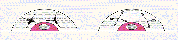 Агглютинация бактерий в микрокаплях, содержащих одну антителообразующую клетку (выделена цветом). Соматическая агглютинация антителами к О-антигену (слева) и жгутиковая к Н –антигену.
