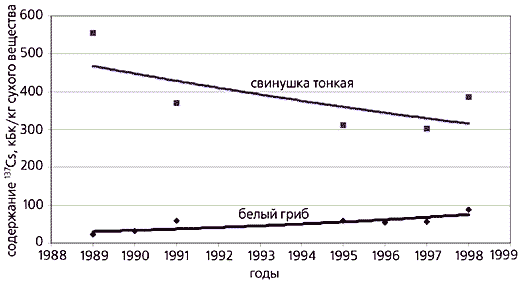 Какова многолетняя динамика содержания 137Cs в грибах? На этот счет существуют различные точки зрения. По мнению одних исследователей, концентрация 137Cs в грибах со временем очень медленно уменьшается, по мнению других - остается почти неизменной, с незначительными вариациями по годам, поскольку радионуклиды аккумулируются в мицелии. В результате длительных наблюдений установлено, что многолетняя динамика накопления 137Cs грибами меняется в зависимости от физико-химической природы радиоактивных выпадений; климатических и экологических условий (типа почвы и особенностей строения подстилки), а также видовых различий грибов, в частности глубины распространения мицелия. Для видов с поверхностным расположением мицелия (например, свинушки тонкой) она снижается в 1.5-6 раз (в зависимости от видовой принадлежности и типа биогеоценоза). Для видов с более глубоким расположением мицелия (желчного и белого грибов) в настоящее время концентрация 137Cs в плодовых телах увеличивается. По прогнозам немецких специалистов, к 2011 г. содержание 137Cs в грибах, мицелий которых в основном расположен в минеральных горизонтах почвы, вырастет на 140%, а в видах с мицелием, находящимся в верхних слоях лесной подстилки, уменьшится до 1% от первоначального уровня [13].