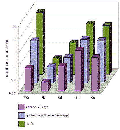 * 1 мЗв/год - фоновый уровень облучения человека в нормальных условиях.Итак, анализ коэффициентов накопления тяжелых металлов и радиоактивного цезия (отношение концентрации элемента в компоненте к концентрации в почве) показал, что в биоте лесного биогеоценоза грибы - самые сильные накопители всех элементов (в особенности 137Cs). В травяно-кустарничковой растительности и структурных частях древесного яруса этих элементов гораздо меньше. Значит, при употреблении грибов, собранных в загрязненных радионуклидами и тяжелыми металлами лесах, высока вероятность не только внутреннего облучения, но и усиленного воздействия этих элементов на организм человека. Отсюда очевидно, что в условиях техногенного загрязнения наиболее действенная мера - просто не есть собранные в лесу грибы и выращивать их в искусственных условиях. Сегодня современные технологии вполне могут обеспечить всех любителей грибов этим продуктом.Работа выполнена при поддержке Российского фонда фундаментальных исследований.