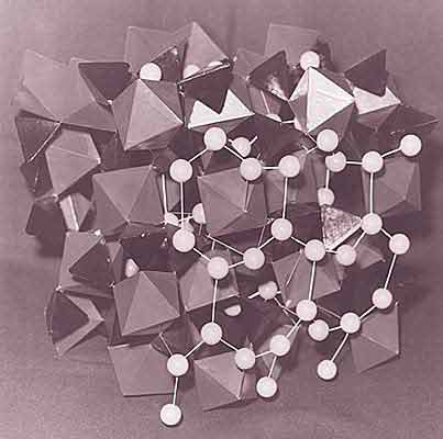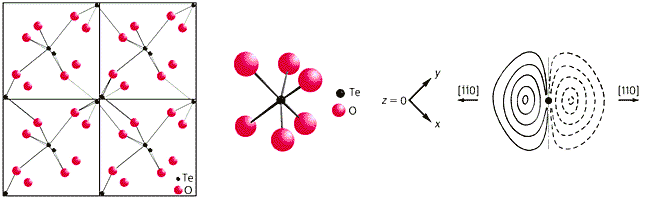 Через общие атомы кислорода все группы [TeO6] объединены в трехмерный каркас. При этом каждый атом О связан с тремя атомами Те: от одного теллура кислород находится на близком расстоянии, от второго на среднем и от третьего - на увеличенном расстоянии. Такое распределение химических связей в кристалле обусловлено электронной структурой атомов Те. Потенциалы атом-атомного взаимодействия в кристаллах существенно несимметричны. Для сближения атомов по сравнению с равновесным расстоянием требуется больше усилий, чем для растяжения соответствующей химической связи. В пределе это означает, что нельзя вдавить атом в атом, но вполне реально разорвать химическую связь, скажем, нагреванием до температуры плавления кристаллического образца.