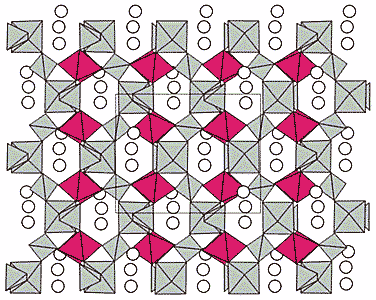 Цепочки из [TiO6]-октаэдров объединены [PO4]-тетраэдрами в каркас.