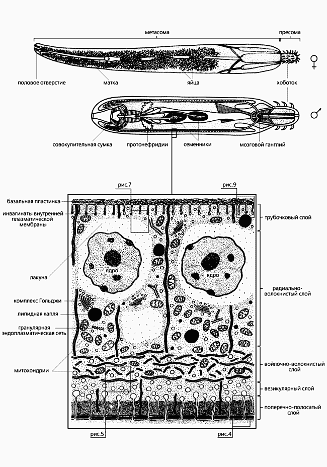 Один (из рода Moniliformis) паразитирует в кишечнике грызунов (слева), другой (Corynosoma strumosum) - тюленей.Морфология скребней на первый взгляд довольно однообразна. Обычно это небольшие черви длиной до одного-двух сантиметров, и лишь некоторые виды достигают больших размеров. Например, скребень-великан M.hirudinaceus (паразит свиньи, а иногда и человека) вырастает до полуметра и более. Ланцетовидное тело скребней отчетливо делится на две части (рис.3). Передняя (пресома) - состоит из относительно большого и подвижного хоботка, вооруженного крючьями (их количество и расположение служат основными таксономическими признаками), а также из небольшой шейки. В задней части (метасоме) размещены органы половой системы и выделительной (в случае ее наличия). Пищеварительный тракт отсутствует. Скребни осмотрофы, т.е. питаются, всасывая необходимые вещества всей поверхностью тела. Своеобразно устроен и эпителий - не из отдельных клеток, как у большинства многоклеточных животных, а в виде сплошного цитоплазматического пласта, в котором ядра (кстати, их число ограничено, что также служит систематическим признаком), как и у обычных эпителиальных клеток, располагаются в базальной части. Получается, что весь покров скребней образован единой многоядерной клеткой (симпластом), которой свойственны функции не только “нормального” эпителия, входящего в состав кожного покрова (защита, опора, транспорт, секреция и т.д.), но и пищеварительных эпителиев (всасывание, секреция ферментов и т.д.). Чтобы подчеркнуть столь необычную организацию и многофункциональность пограничной ткани скребней, для нее был принят специальный термин “тегумент” [1] (см. рис.3).