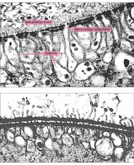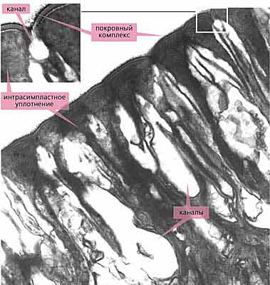 У цестод, как известно, на поверхности тегумента формируются специализированные микроворсинки (микротрихии), выполняющие помимо всасывания и другие функции. Но у цестод нет покровного комплекса и интрасимпластного уплотнения, поэтому такая конструкция их вполне устраивает. У скребней же весь поверхностный отдел тегумента пронизан каналами, открывающимися на поверхности червя и слепо заканчивающимися в глубине тегумента. (Благодаря этим каналам поверхностный отдел тегумента назван поперечно-полосатым, или просто полосатым, слоем). Причем заканчиваются каналы значительно глубже интрасимпластного уплотнения и обязательно в виде расширенных пузырьков. Стенки каналов и соответственно концевых пузырьков образованы только цитоплазматической мембраной и не имеют покровного комплекса, поэтому ничто не мешает перемещению всасываемых субстанций в глубь тегумента. Что же касается площади поверхности цитоплазматической мембраны, через которую осуществляется питание червей, то, по разным оценкам, оно может достигать 20-, 40- и даже 60-кратного увеличения в зависимости от степени ветвления каналов, а также вида и экологии скребня. Надо сказать, что функции каналов не ограничиваются питанием, но об этом чуть позже.