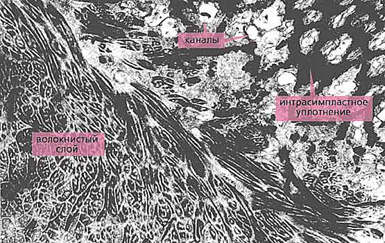 Рис.5. Дистальная часть войлочно-волокнистого слоя тегумента метасомы скребня Polymorphys magnus. Заметно упорядоченное расположение волокон, каждое из которых состоит из нескольких субъединиц. В поперечно-полосатом слое видны расширенные основания каналов, между которыми находится интрасимпластное уплотнение. Увел. 12 800.Эти волокна образуют войлочно-волокнистый (или просто войлочный) слой тегумента, степень развития которого зависит от окончательного хозяина. Например, у рыбьих скребней эти волокна менее многочисленны и неупорядочены, поскольку пищеварительный тракт рыб оказывает на паразитов меньшие механические воздействия, чем, скажем, кишечник околоводных птиц. Волокна войлочного слоя у птичьих скребней упорядочены и организованы в несколько (до пяти) субслоев. Разумеется, все эти образования выполняют не только защитную функцию, но и опорную [4], за которую у многих других беспозвоночных ответственна кутикула.Казалось бы, столь действенные защитные системы должны препятствовать движению всасываемой пищи в глубь тегумента для дальнейшей переработки. Без сомнения, они и препятствуют, и поэтому эволюция снабдила скребней великолепным механизмом, позволяющим не только преодолеть ею же созданные барьеры, но и многократно увеличить всасывающую поверхность.