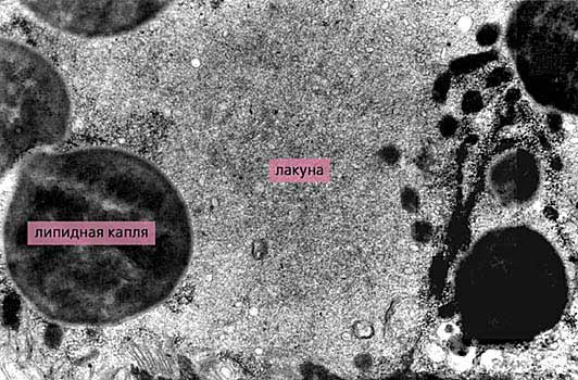 Рис.7. Фрагмент лакуны, окруженный липидными каплями, митохондриями и волокнами, из внутренней части тегумента метасомы зрелой личинки скребня Polymorphys magnus. Увел. 15 400.Сказанным особенности лакун не исчерпываются. У скребней тегументы метасомы и пресомы на уровне основания шейки разделены особой перегородкой, и в тегументе каждого отдела есть своя лакунная система. Кроме того, введением различных веществ, в том числе и красящих, обнаружена еще одна лакунная система, на этот раз в субповерхностных мышцах, которая сообщается с лакунной системой тегумента метасомы [6]. Это означает, что содержимое лакун может перемещаться при сокращении и расслаблении мышц. Кстати, кожная мускулатура скребней в функционально-морфологическом отношении заслуживает не меньшего внимания, чем тегумент, но это уже другая тема.Как упоминалось, в число обязательных функций тегумента входит выделение, или секреция. Об одном из проявлений этой функции - отделении вершин микроворсинок у личинок скребней (что в сущности не что иное, как секреция по микроапокринному типу) - уже говорилось. Подобное явление достаточно часто встречается в природе, и характерно, например для ленточных червей. Однако тегументу скребней присущи еще, как минимум, два типа секреции, не отмеченных у других животных, в том числе и паразитических. Оба они осуществляются с участием каналов поперечно-полосатого слоя. Один из них (тоже упомянутый) наблюдается в конце личиночной стадии, когда разово и быстро выделяется плотный материал (его состав пока не исследован), образующий на поверхности личинки сплошной слой, пронизанный микроворсинками. Впоследствии этот слой вместе с микроворсинками отделяется от тегумента и формирует внутреннюю часть цисты [5] (см. рис.6).