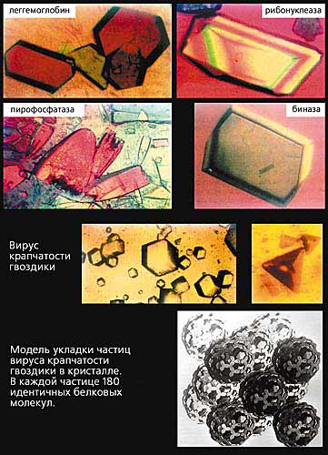 Рис.1. Кристаллы некоторых ферментов (слева) и вирусов, полученные в Институте кристаллографии РАН.