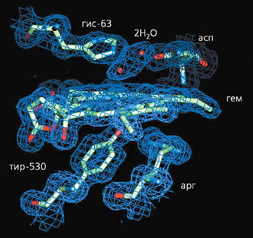 включающий гем (плоская группа в центре рисунка), аминокислотные остатки гистидина и аспарагина (вверху),