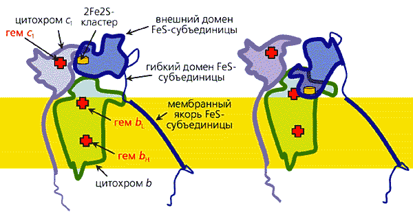 Электроны поступают от янтарной кислоты (сукцината), которая в ходе окисления углеводов в цикле трикарбоновых кислот превращается в фумаровую кислоту. Вначале электроны восстанавливают флавинадениндинуклеотид (ФАД), а затем последовательно передаются на другие коферменты: три железосерные центра, коэнзим Q и гемовую группу цитохрома b. Путь (примерно 70 A) электронов внутри комплекса показан красной стрелкой.Согласно современным представлениям, перенос электронов внутри белковых молекул может осуществляться двумя путями: с помощью эстафетной передачи между подвижными доменами и благодаря туннельному эффекту.Рассмотрим механизм эстафетной передачи на примере дыхательного комплекса III (комплекс bc1). Анализ белковой кристаллографии и ряда других результатов показал, что на участке гем цитохрома c1 ® ® 2Fe2S-центр ® гем bL цитохрома b электроны переносятся путем последовательного взаимодействия железосерного центра сначала с гемом цитохрома c1, а потом с гемом bL цитохрома b (рис.8).