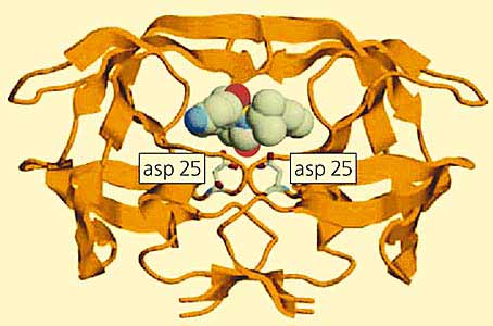 Знание трехмерной структуры белков-мишеней - отправная точка для конструирования лекарств с помощью топографии контактирующих поверхностей лиганда (связываемой молекулы, например субстрата, ингибитора или лекарства) и его белковых мишеней. Эти две поверхности должны повторять форму друг друга и содержать как можно больше точек притяжения - противоположных зарядов, участников водородных связей или просто гидрофобных групп. Такая информация может помочь химикам синтезировать новые вещества, которые должны лучше взаимодействовать с белками. Такие препараты будут более эффективными и избирательными. В продаже уже есть лекарства, созданные так называемым методом драг-дизайн (конструирование лекарств). К ним относятся препараты против вируса иммунодефицита человека, такие как ампренавир (Agenerase) и нелфинавир (Viracept), полученные на основе использования структуры кристаллов ВИЧ-протеазы (рис.10).