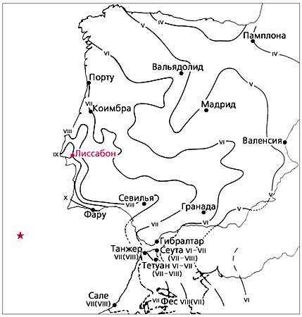 Карта изосейст Лиссабонского землетрясения в пределах Иберийского п-ова [7, 13].