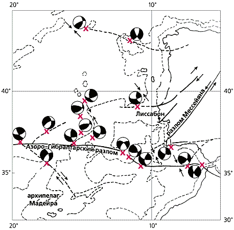 Звездочкой показан эпицентр землетрясения.Несколько публикаций появилось совсем недавно. Какой раз подтверждается мудрость - кто не знает прошлого, не может владеть будущим. За прошедшие 250 лет произошло немало сейсмических событий в Атлантике, в том числе в относительной близости к берегам Португалии. В XX в. они фиксировались инструментально в 1931, 1939, 1941, 1969, 1975. Предпоследнее рассматривается теперь как уменьшенная модель землетрясения 1755 г. Выяснились два важных факта. Во-первых, эпицентры выстраиваются в цепочку, направленную широтно от Срединно-Атлантического хребта в сторону Гибралтара, и, во-вторых, механизмы очагов в западной части зоны обнаруживают правосдвиговые смещения, тогда как ближе к португальским берегам в очагах преобладает поперечное взбрасывание. Ныне очаг землетрясения 1755 г. соотносят с участком пересечения главной широтной зоны разломов с оперяющим разломом Мессейяна, тянущимся в северо-восточном направлении к Иберийскому п-ову. Точное положение эпицентра установить невозможно, но принципиально важно знать, что примерно в 300-350 км от него на португальском берегу максимально зарегистрированные сотрясения достигали Х баллов. Это значит, что в эпицентре они должны были соответствовать ХI баллам (если не более).