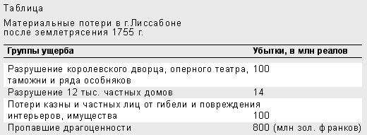 Сейчас становится обязательной заблаговременная оценка риска сейсмических событий. Непременным компонентом ее служит знание ущерба от катастроф прошлого. С этой точки зрения интересно привести малоизвестные определения материальных потерь в самом Лиссабоне (см. табл.), сделанные сразу после землетрясения. (Напомним, что, потеряв главенствующую роль в Европе, Португалия в середине XVIII в. оставалась еще сокровищницей накопленных в былые времена несметных богатств, материальных и художественных.) А еще пропавший флот, церковные ценности, особенно в многочисленных монастырях. А как оценить гибель 18 тыс. (по другим данным - 70 тыс.) томов Королевской библиотеки, архитектурных шедевров средневекового города, богатейшего архива Португальского Королевства, древних рукописей и церковных архивов… В королевском дворце хранились 200 полотен Рубенса, Корреджо, Тициана и др. В бесценной библиотеке - карты мира (в том числе древние портоланы), инкунабулы (первопечатные книги до 1500 г.), собственноручная история Карла V (середина XVI в.).