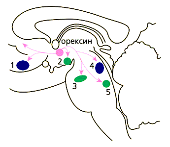 В большинстве нейронов орексин присутствует вместе с другим пептидом - динорфином. Во всех орексиновых клетках гипоталамуса имеется особый секретируемый нейрональный белок NARP (“пентраксин, регулирующий нейронную активность”). Он связан с регуляцией синапсов и кодируется одним из “немедленных ранних генов”, которые быстро экспрессируются (активируются) в нейронах при повышении их метаболической активности. В числе прочих орексинергические нейроны проецируются и на норадренергические клетки синего пятна, вызывая их деполяризацию - активацию, “подбуживание”. При недостаточной активации нейроны синего пятна могут внезапно “замолкать” не только во время парадоксального сна (как им положено), но и при бодрствовании, вызывая приступы нарколепсии [6].