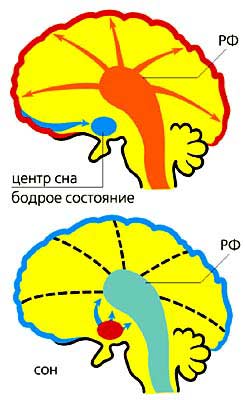 внизу - центр сна возбужден, РФ заторможена и кора не активируется.
