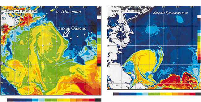 Один из них, названный WCR86B (вихрь Куросио 1986 г. с теплым ядром), отделился от течения Куросио примерно у 37°с.ш. и двигался вдоль желоба против течения на северо-восток со скоростью около 1-2 см·с–1. В сентябре 1990 г. он достиг широты пролива Буссоль (46.5°с.ш.), отделяющего южную группу Курильских о-вов от средней. Даже так далеко от места своего появления он содержал теплое и соленое ядро в верхнем слое воды (что обычно для вихрей Куросио у побережья Японии) и ядро низкой солености в промежуточных слоях (250-600 м). (Из-за этого вихри Ойясио называют вихрями с пресным ядром.) Слежение за вихрем проводилось с помощью последовательных съемок [2-6] на судах Тихоокеанского океанологического института (ТОИ) и непрерывных спутниковых изображений, принятых и обработанных в Институте автоматики и процессов управления ДВО РАН.
