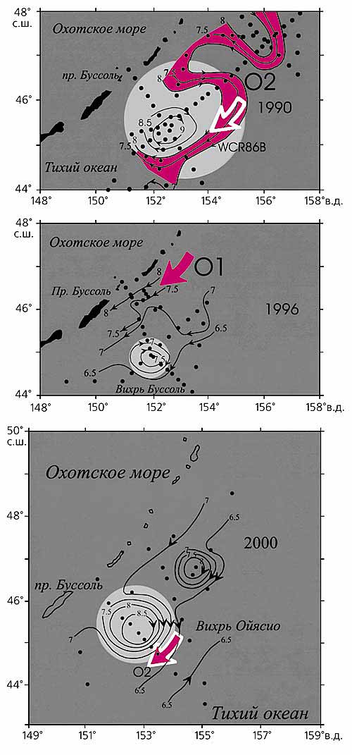 Вихри у южных Курильских о-вов. Инфракрасное изображение, полученное со спутника НОАА в Центре приема спутниковой информации Института автоматики и процессов управления ДВО РАН. Шкала цвета соответствует увеличению температуры слева направо и снизу вверх. Белые точки - положение океанографических станций на разрезе через вихрь Ойясио. Слева - в мае 2000 г., когда здесь располагался самый крупный антициклонический вихрь, который наблюдался в регионе; справа - в апреле 2001 г. Динамическая топография (возвышения поверхности океана из-за разного распределения плотности) вихрей у пролива Буссоль в разные годы. Серым цветом показаны вихри Ойясио, красными стрелками - положение струй Ойясио. Хорошо заметно изменение размеров вихрей и смена главных струй течения: с морской (02 – 1990 г.) на прибрежную (01 – 1996 г.) и снова на морскую (в 2000 г.). Рисунок из работы [4].