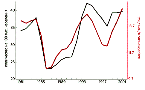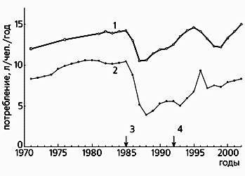 Неоспоримые факты резкого сокращения продажи спиртных напитков и всех жестко зависимых от них болезней (психозов, отравлений и циррозов печени), а также насильственных смертей и преступности [5] говорят о том, что в 1985-1986 гг. даже закоренелые пьяницы стали пить существенно меньше. Известно, что население страны по отношению к выпивке представляет собой более или менее жестко взаимосвязанный конгломерат [6, 7], который подчиняется одному из законов алкологии: сокращение среднедушевого потребления спиртного отражает общую тенденцию, как для мало, так и для много пьющих. Россия никак не могла быть исключением из этого правила, поскольку антиалкогольные мероприятия касались всего общества, включая самых активных пьяниц. Тотальный характер прессинга проявился в том, что во время кампании снизились зависимые от алкоголя показатели смертности и заболеваемости (причем линейно по отношению к потреблению). * * *
