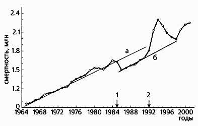 2 - начало рыночных реформ;пунктиром обозначены линии регрессии: а - 1965-1984 гг., б - 1986-1991 гг. С 1965 по 1984 г. общая смертность довольно равномерно увеличивалась (рис.2). За 20 лет сократилась ожидаемая продолжительность жизни, особенно у мужчин (на 2.5 года: с 64.5 до 62 лет), что отчасти связано с ростом потребления спиртного. Ведь с 1960 по 1980 г. его продажа увеличилась более чем в два раза (с 4.6 до 10.5 л), а реальный рост с 9.8 до 14.0 л. При этом в два раза повысилась смертность от отравления алкоголем. Однако из этих данных трудно вычленить алкогольный фактор среди других неблагоприятных явлений и оценить его роль в сокращении продолжительности жизни населения. Сделать это помогла кампания.