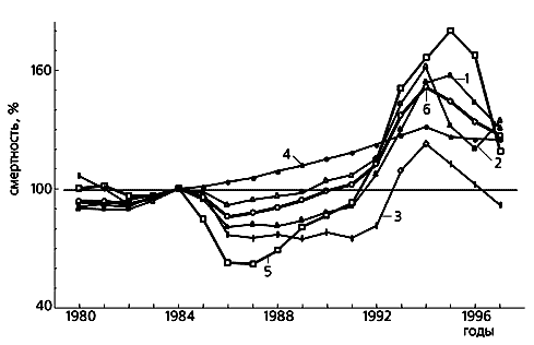 Кампания показала, что главный вклад в алкогольную смертность мужчин (44.9%) вносили травмы, отравления и несчастные случаи. В 1981-1984 гг. у 53.1% (Москва) и 58.4% (Россия) умерших по этим причинам в крови был выявлен алкоголь. Однако в государственной статистике доля смертей “в состоянии опьянения” лишь в отдельные годы превышала 10%. Среди этой большой группы особое место занимают такие социально значимые явления, как самоубийства и убийства. Россия занимает одно из первых мест в мире по количеству самоубийств: от 37.9 в 1984 г. до 42.1 в 1994 г. (на 100 тыс. жителей), уступая в Европе только Литве (47.3 в 1994 г.). В 1984 г. 43 тыс. мужчин и 11 тыс. женщин покончили с собой. В 1994 г. количество самоубийств было максимальным (как и потребление), а затем началось снижение, продолжавшееся до 1998 г. (рис.4).Рис. 3. Смертность мужчин в России в 1980-1997 гг. от разных причин: заболеваний органов пищеварения (1), сердечно-сосудистых (2), дыхательных(3), опухолевых, инфекционных и паразитарных (4), от внешних причин (5), в среднем (6). Данные 1984 г. приняты за 100%.