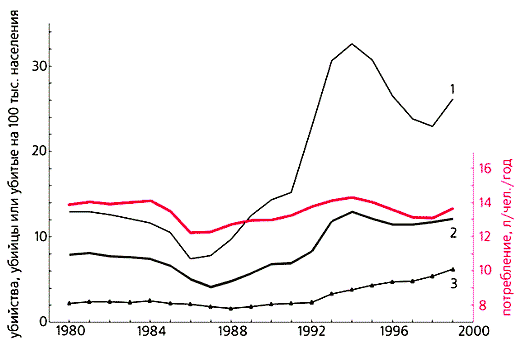 в сравнении с потреблением алкоголя (цветная кривая).По аналогии с самоубийствами соотношение убитых трезвых и с алкоголем в крови можно исследовать в тех же регионах России: последние в 1981-1984 гг. составляли 64%; в 1988 г. - 59%, а в 1990 г. - 64%. Эти данные показывают, что помимо социально-экономических причин во время “первой криминальной войны” роль спиртного оставалась очень высокой: рост числа убитых в пьяном состоянии происходил в два раза быстрее, чем в трезвом.