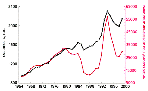 Рис. 7. Соотношение общей смертности и смертей при отравлении алкоголем (цветная кривая).