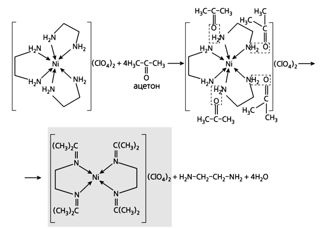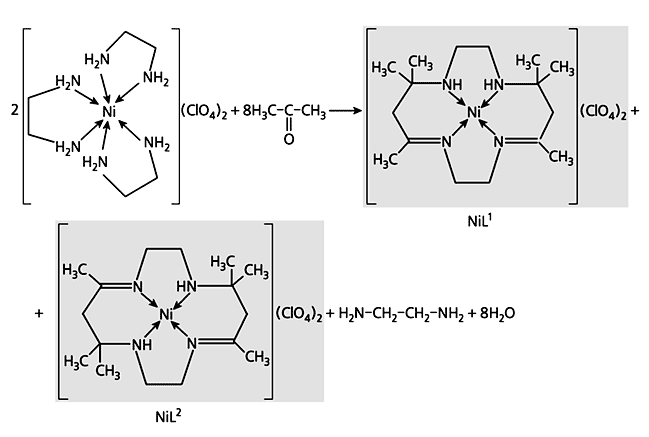 Продолжение этой истории последовало более 30 лет спустя, когда в начале 1960 г. малоизвестный в ту пору новозеландский химик Н.Куртис произвел нехитрый эксперимент - попытался растворить в ацетоне перхлорат трис(1,2-этилендиамино)никеля(II). Куртис вынужден был отлучиться из лаборатории на некоторое время, а по возвращении неожиданно для себя обнаружил, что из раствора выпали красивые ярко-желтые кристаллы. Пытаясь разобраться в необычном феномене, он сначала решил, что это результат хорошо известной в органической химии реакции дегидратации (схема 1). Но потом понял, что ошибался. Хотя без дегидратации здесь и впрямь не обошлось, в действительности образовались координационные соединения никеля(II) с новыми тетрадентатными лигандами L1 и L2 (схема 2).