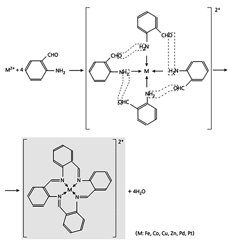 Схема 1. Реакция дегидратации, которую Н.Куртис счел сначала “виновницей” образования нового координационного соединения, выпавшего в осадок при стоянии в виде ярко-желтых кристаллов.Вскоре американский химик Д.Буш обратил внимание на весьма специфическое образование комплекса при взаимодействии 2-аминобензальдегида с ионами ряда 3d-элементов. К тому времени выраженная способность этого соединения к самоконденсации с возникновением линейных и циклических полимеров уже не была откровением. Изучавшие 2-аминобензальдегид незадолго до Буша его соотечественники Г.Эйхорн и Р.Латиф высказали мнение, что ионы 3d-элементов вступают в комплексообразование с его линейным тримером. Буш, однако, установил, что на самом деле ситуация куда сложнее и интереснее: в присутствии VO(II) возникают координационные соединения с циклическим тримером 2-аминобензальдегида (схема 3), другие металлы - железо, кобальт, медь, цинк, палладий или платина (все со степенью окисления 2) - с его циклическим тетрамером (схема 4), а при наличии Ni(II) и Co(III) образуется смесь комплексов обоих этих типов.