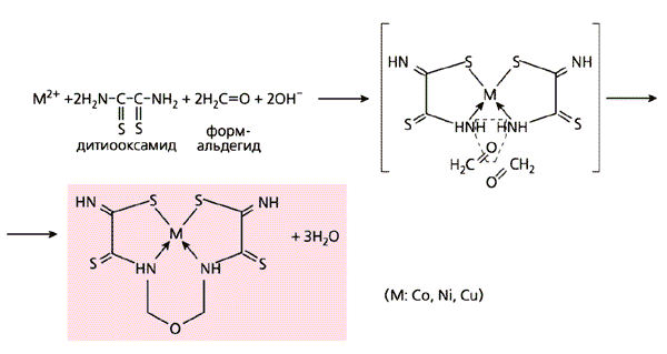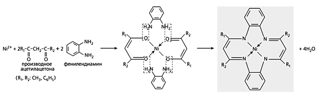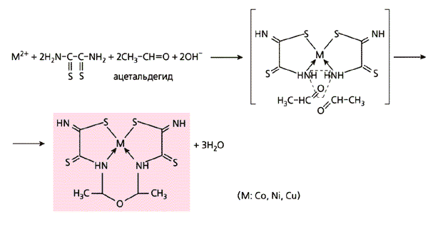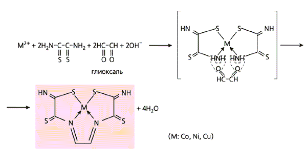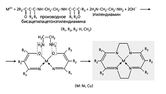 Схема 5. Реакция образования хелатов никеля и кобальта, проведенная Э.Егером.Есть еще одна любопытная черта каждой из упомянутых реакций: того лиганда, который находится во внутренней координационной сфере сформировавшегося хелатного комплекса, среди исходных веществ не было - он образовывался из более простых химических соединений, причем в присутствии конкретного иона металла. И синтез металлохелатов был осуществлен не по классической схеме ион металла + лиганд ® комплекс, а по схеме ион металла + + “осколки” лиганда ® комплекс, да к тому же из “осколков”, которые вроде бы и склеить-то друг с другом никак нельзя. Химики-органики давно уже научились получать соединения исключительной структурной сложности в реакциях сочетания. Так что не выглядит слишком необычной идея использовать аналогичный по сути прием и для получения координационных соединений, в ходе которого органический лиганд образуется прямо в процессе синтеза самого комплекса из более простых строительных блоков. Довольно скоро стало ясно: природа иона металла оказывает подчас решающее влияние не только на характер продуктов подобных реакций, но и на возможность их осуществить.
