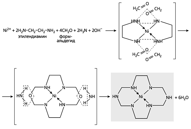 участвовавшие в координировании к иону металла, в конечном продукте полностью заменены на атомы азота.Обычно темплатный синтез осуществляется с участием двух лигсонов, однако в строительстве макроциклических соединений могут быть одновременно задействованы три и больше. Пример такого рода - процесс в четверной системе Ni(II)-1,2-этилендиамин-формальдегид-аммиак (схема 7).