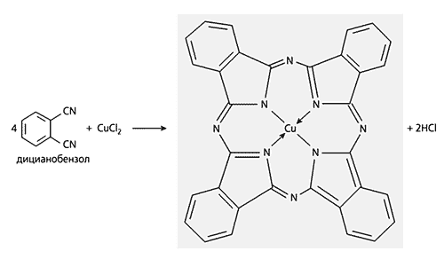 Схема 7. Пример темплатного синтеза с участием трех лигсонов.Описанные здесь темплатные реакции, да и практически все известные, так или иначе связаны с дегидратацией. К числу немногих исключений относится оригинальная реакция синтеза фталоцианина меди(II) (схема 8).