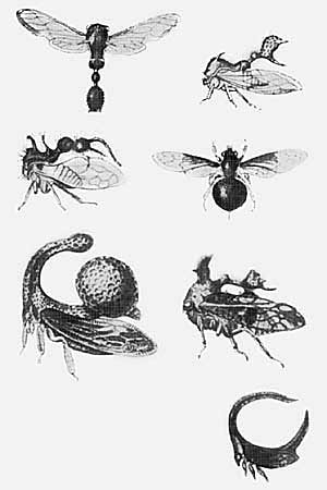 Нередко диагностические признаки имеют двойственную природу: и приспособительную, и как бы случайную. Так, шипики в жевательном желудке короедов нужны для превращения древесины в опилки. Отличия в вооружении желудков у разных видов тоже понятны. Ведь исходная прочность древесины, к которой специализированы короеды, не одинакова: одному требуется “рашпиль”, а другому - мелкозубчатый “напильник”. Но почему рельеф желудка неповторим у десятков видов? А нередко видоспецифические орнаменты покрывают и поверхности, не используемые в качестве абразивных. Ихтиолог Л.С.Берг, адепт законов, направляющих эволюцию, в качестве структур непонятного назначения приводил выросты переднеспинки у небольших насекомых горбаток (рис.1) [1]. На самом деле выросты делают горбаток колючими. Так что их полезность сомнения не вызывает. Но почему они именно такой формы и настолько отличаются у разных видов?