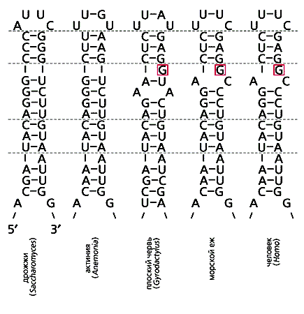 У всех организмов, от бактерии до человека, рибосомная РНК выполняет одинаковую функцию - участвует в синтезе белка. Одни ее участки почти неизменны, другие изменчивы по составу, но образуют консервативные элементы вторичной структуры, например короткие внутримолекулярные двойные спирали, соединенные уотсон-криковскими парами. Если нуклеотид в одной ветви меняется, то для сохранения спирали меняется и противолежащий - комплементарный ему [5]. Конечно, компенсация возникает не из-за целесообразности мутаций. Просто нейтральными (а только они могут сохраниться) оказываются двойные мутации.