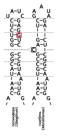 Подобная специфичность обнаруживается и в спирали 49 рРНК. Так, у многих видов в определенном участке вместо комплементарной уотсон-криковской пары закономерно находятся два неспаренных пиримидина. Но у пяти отрядов круглых червей Dorylaimia они или смещены с 19-й пары на 18-ю или 20-ю, или окружены необычными нуклеотидами, притом современные последовательности нельзя легко вывести одну из другой (рис.3). Значит, уже у их общего предка нарушилась комплементарность соседних пар, а затем произошла полная или частичная компенсация (в разных отрядах независимо, за счет либо обратных, либо компенсаторных мутаций). Стабилизировать одну или две пары из трех можно 18 способами, и не удивительно, что в пяти отрядах Dorylaimia все они разные.