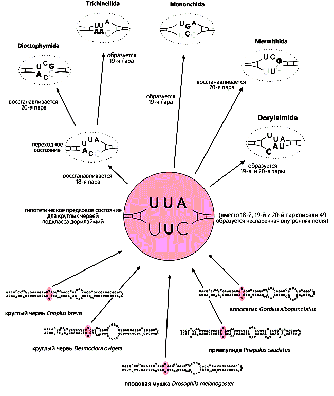 Другие животные без кишечника, паразитические колючеголовые черви или скребни (Acanthocephala), потеряли типичный “лишний” нуклеотид, но приобрели вместо него свой, специфический. Он у них пиримидин, а не пурин и находится в 5’-, а не в 3’-ветви спирали 17. Круглые черви на первый взгляд “вернулись” к предковому состоянию спирали: у них нет неспаренного нуклеотида и общая длина спирали 13 пар. Но если у растений, грибов, протистов и “радиальных” животных в четвертой паре от вершины в 3’-ветви почти всегда находится пиримидин (обычно остаток тимидина), то у нематод - пурин (гуанин, реже аденин), как положено “лишнему” нуклеотиду Bilateria, номер которого - четвертый. Похоже, круглые черви избавились не от “лишнего”, а от следующего за ним нуклеотида.