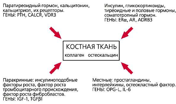 частоты полиморфизмов которых изучены в нашей лаборатории.Примером рецепторного гена может быть рецептор мужских половых гормонов — адрено-рецептор, ассоциированный с раком предстательной железы, или ген рецептора витамина D, обнаруживший четкую ассоциацию с таким частым заболеванием, как остеопороз (быстрая потеря минеральной плотности кости). Молекулярно-генетическое исследование этого заболевания, проведенное в нашей лаборатории, позволило разработать и внедрить в практику схему обследования для раннего обнаружения лиц с наследственной предрасположенностью. Сравнивая частоту полиморфных аллелей и соответствующих им генотипов по генам остеопороза у больных в популяции северо-западной части России, мы показали достоверную ассоциацию функциональной неполноценности двух генов (гена рецептора витамина D и гена коллагена) с развитием болезни. Изученные нами гены непосредственно вовлечены в процессы остеогенеза, хотя механизмы их действия различны (рис.2). Рецептор витамина D влияет на гормональную регуляцию остеогенеза, а сам коллаген — важная составная часть костной ткани. Согласно нашим данным, анализ аллелей этих двух генов способствует выявлению предрасположенности к остеопорозу и соответственно делает возможной раннюю профилактику [5].