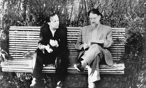 Cлева - А.Д. Сахаров.Вот эта деталь запомнилась, запомнился висящий в его кабинете большой портрет Сталина, во весь рост, в сапогах. А также запомнилось то, что во время нашей беседы вошел Л.А.Арцимович и начал тихо разговаривать с Курчатовым в нашем присутствии, потом они вдруг открыли потайную дверь, о существовании которой мы с Романовым и не подозревали, зашли в помещение за ней и там беседовали. Потом Арцимович ушел. Задав нам это задание, сущность которого я, к сожалению, совершенно не помню, Курчатов, как я теперь думаю, хотел проверить достоверность каких-то данных об энерговыделении (иначе зачем он вызвал именно нас), полученных, возможно, из-за границы. Мы с Романовым сидели в какой-то секретной комнате, принадлежащей первому отделу, и проводили расчеты. Возможно, наши записи где-то сохранились. Каково же было наше удивление, когда мы пришли и стали докладывать Курчатову свои результаты - он остался недоволен! “Нет, я неудовлетворен, завтра приедете и продолжите расчеты”. На следующий день мы снова считали и в конце концов как-то удовлетворили его. Я думаю, что наши первоначальные результаты либо не совпадали с его ожиданиями, либо он хотел убедиться, что мы не сделали ошибок. Однако я уверен, что мы проверяли не его собственные идеи.
