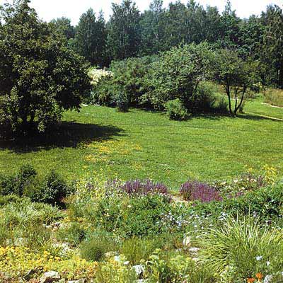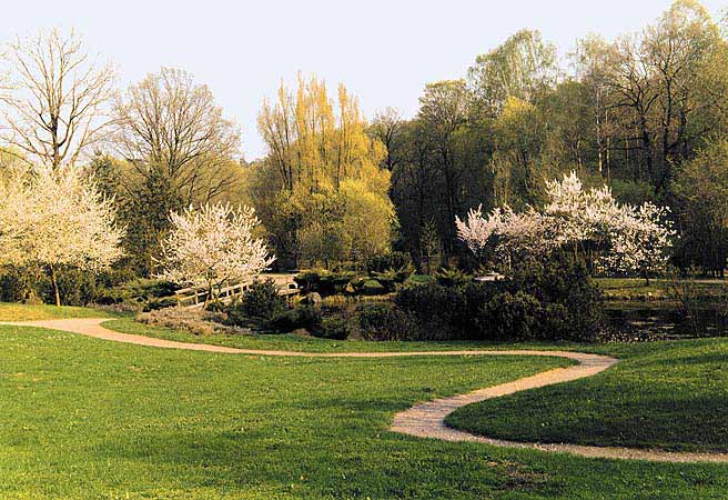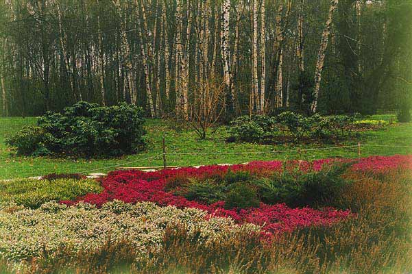 Вдоль северной границы дендрария расположены на редкость живописные поляны, окруженные вековыми дубами и рощицами иноземных видов боярышника, клена, ореха, бересклета и барбариса. Осенью, в пору “карнавала деревьев”, когда их листва раскрашена во все тона золотого и пурпурного, прогулка по этой части сада оставляет незабываемое впечатление. Мягкие лучи осеннего солнца словно заставляют светиться все листья волшебным огнем. Неторопливое кружение падающих листьев, специфический воздух осеннего леса, в котором смешаны запахи увядающей листвы, грибов, каких-то незнакомых плодов — вот те впечатления, что дарит осенний сад. А позже, когда пройдут дожди и деревья лишатся своего осеннего убранства, четче обозначится графика стволов и ветвей деревьев, можно будет любоваться россыпью ярких плодов бересклета и рябины с застывшими на них каплями влаги.