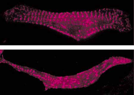 Микрофотографии актиновых филаментов нормальных эмбриональных кардиомиоцитов (вверху) и обработанных антисмысловым олигонуклеотидом к мРНК КЛЦМ и KRP, избирательно подавляющим синтез этих белков. Расположение белка a-актинина, образующего Z-диски, выявляли красным флуоресцентным красителем. В контрольных кардиомиоцитах видны формирующиеся саркомеры, в клетках без КЛЦМ и KRP образование саркомеров нарушено.Процесс образования новых миофибрилл происходит и во взрослом сердце. Как известно, клетки сердца не делятся, но способны отвечать на возрастающую гемодинамическую нагрузку путем увеличения массы и мощности сократительного аппарата. Такая гипертрофия сердца может происходить как в норме (например, у спортсменов, испытывающих большие физические нагрузки), так и при заболеваниях сердца различной этиологии. В наиболее тяжелых формах разрастание ткани сердца приводит к сокращению размеров его камер, снижению объема выбрасываемой крови и представляет угрозу для жизни пациента. Единственный радикальный в наши дни метод лечения таких состояний - оперативное удаление части миокарда, которое продлевает жизнь больного, но не устраняет причину заболевания. Исследование молекулярных механизмов гипертрофии миокарда может дать ту необходимую информацию, которая позволит установить диагноз на ранней стадии, провести фармакологическое лечение и избежать операции. Ранними маркерами гипертрофии и соответственно потенциальными мишенями для воздействия лекарств могут быть именно КЛЦМ и KRP. В экспериментах на животных установлено, что гипертрофия миокарда сопровождается увеличением синтеза этих белков [11, 12]. Эти данные были подтверждены и при обследовании людей, страдающих той же патологией [13]. Вероятно, при гипертрофии сердечная клетка запускает тот же молекулярный механизм, что и в эмбриональный период, когда происходил синтез миофибрилл, регулируемый КЛЦМ и KRP. Подавив в культивируемых кардиомиоцитах биосинтез этих регуляторных компонентов, удалось остановить сборку миофибрилл. Остается лишь разработать антигипертрофические лекарственные препараты, и бороться с этим тяжелейшим недугом человека станет намного проще.Значительно сложнее лечить наследственные формы гипертрофии миокарда, связанные с мутациями генов, кодирующих синтез миозина, тропонина, титина и других белков саркомера. Естественно, организм сам пытается справиться с возникшими нарушениями, но вновь синтезированные миозиновые моторы или аномальные саркомеры также несут врожденные дефекты, и это только усугубляет положение. Сейчас такие заболевания уже можно выявить с помощью генетических методов, а в перспективе, с дальнейшим развитием методов генной и клеточной терапии, их можно будет лечить, заменяя дефектные гены или несущие их клетки на нормальные. Ясно, что для успешной репарации компонентов сердечно-сосудистой системы совершенно необходимы фундаментальные исследования в области клеточной подвижности, ведь список белковых компонентов двигательной системы клетки не ограничивается миозином, КЛЦМ и KRP, рассмотренных в этой короткой статье. Более того, регулярно появляются сообщения об открытии новых белков, участвующих в клеточной подвижности, что отражает сложность и многогранность процесса. Его изучение сегодня требует мультидисц