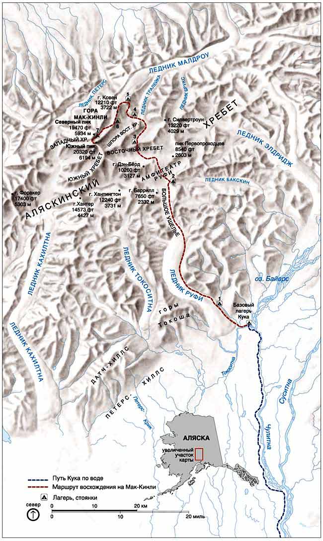 В амфитеатр ледника Руфи, расположенный по отношению к вершине горы на юго-востоке, впадают три рукава глетчера: Северный, Северо-Западный и Западный. Кук пошел по Северному рукаву, поскольку намеревался подняться на Мак-Кинли с северо-востока. Гигантская гора Дэн-Берд, разделяющая ветви ледника Руфи, осталась у путешественников по левую руку. Кук и Баррилл приближались к Восточному хребту, о существовании которого в ту пору никто не знал. Путешественник зафиксировал это название, написав на составленной после восхождения карте: “Горы от 6000 до 12 000 футов высоты. Нет перевалов для собак и лошадей через эту горную цепь...” [6].