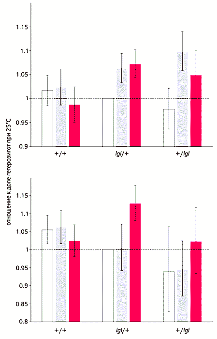 Влияние температуры на жизнеспособность гетерозигот в ранний период развития (вариант А): lgl558/+ (вверху) и lgl705/+ (внизу, p = 0.05). При оптимальной температуре выживаемость гетерозигот lgl/+ либо понижена, либо не отличается от особей с двумя нормальными дозами lgl (+/+); при стрессе (29°С и 16°С) она повышается на 10-15%. Эмбрионы в потомстве матерей-носителей lgl/+ выживают лучше, чем потомство отцов того же генотипа (+/lgl). Пораженная этими популяционными данными, Э.Гатефф (первооткрывательница ракового гена) попросила прислать ей выделенные из природы аллели lgl для проверки их на онкогенность. В гомозиготе все они вызывали опухолевое разрастание имагинальных дисков и нейробластов личинок, различаясь по силе своего действия. Среди них была и полученная нами с помощью радиации нехватка (делеция) сегмента хромосомы, где локализован lgl и еще один соседний ген. В гомозиготе эта делеция тоже вызывала опухоли, не отличаясь от природных lgl-aллелей. Спустя годы стало ясно, что данное наблюдение было, возможно, первым свидетельством возникновения опухоли в результате утраты функции определенного гена [2].