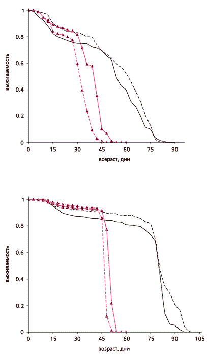 Наши опыты также продемонстрировали сильное стрессовое действие повышенной температуры на продолжительность жизни дрозофил. Забавно, что один день в жизни плодовой мушки примерно соответствует одному году в жизни человека и даже половые различия в длительности жизни сходны. При оптимальной температуре самки контрольной линии жили 84.7 дня, а самцы - 51.7 дня. При 29°С срок жизни сократился у разных полов до 43.7 и 29.6 дней, в полном соответствии с первыми наблюдениями Пирла и Алпатова. Напротив, понижение температуры среды до 16°С продлевало жизнь мух в два-три раза по сравнению с оптимумом.