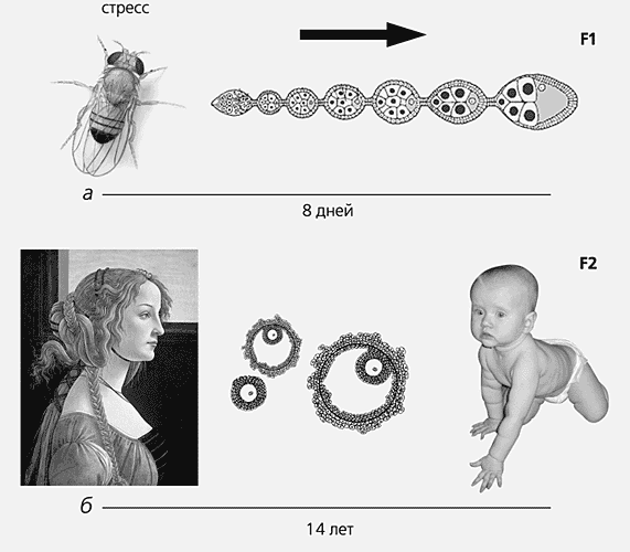 Данный эффект можно отнести к области эпигенетических изменений. Какова генетическая семантика этих опытов применительно к человеку? У женщин клетки-оогонии, соответствующие цистобластам дрозофил, обособляются еще в утробе бабушек, в эмбриональный материнский период. Затем оогонии вступают на путь мейоза, который, однако, сразу после рождения девочек (будущих матерей) блокируется, и до 14 лет идет созревание ооцитов. Модельные опыты на дрозофиле демонстрируют, что условия, в которых проходит беременность у бабушек, способны влиять на выживаемость и долголетие внучатого поколения.