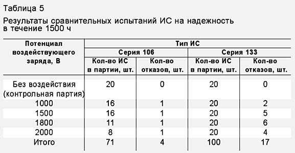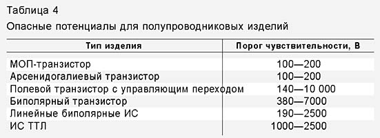 Известно, что отрицательное влияние разряда в первую очередь сказывается на структурах типа металл-оксид-полупроводник (МОП) - устройствах, в которых “работают” носители одной полярности. Однако перечень изделий, особо чувствительных к воздействию разряда, не ограничивается указанными типами. Некоторые биполярные приборы также могут повреждаться разрядами. Например, по этой причине в цифровых ИС наблюдалась деградация входных диодов. Пороги чувствительности некоторых полупроводниковых приборов и ИС приведены в табл.4.
