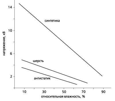 заряжается положительно и тем сильнее, чем более разнесены материалы по шкале.При производстве полупроводниковых изделий электростатический заряд чаще всего возникает из-за трения поверхностей различных материалов, что называется трибоэлектрическим эффектом. Если осуществить контакт двух материалов трибоэлектрической серии, то более высокий в серии материал заряжается положительно, другой получит такой же отрицательный заряд. Величина заряда зависит от силы сжатия при контакте и от способа и качества контакта между материалами. На рис.1 в качестве примера приведены некоторые трибоэлектрические материалы, способствующие образованию статических зарядов. Разность потенциалов при трении материалов трибоэлектрического ряда будет тем большей, чем дальше расположены материалы друг от друга в списке. Например, человек, идущий по сухому ковру, может заряжаться до 5 кВ.; автомобиль, движущийся по сухой дороге, - до 10 кВ., а ремень, движущийся по шкиву, - до 25 кВ.. На операторах, работающих с полупроводниками и одетых в одежду из синтетических материалов, могут возникать потенциалы, превышающие 6 кВ.. Максимальные значения потенциала, до которых может заряжаться тело человека при контактировании с различными материалами в условиях разной относительной влажности, показаны на рис.2, а также даны в табл.1 в сравнении с величинами для некоторых других “электроопасных” объектов.