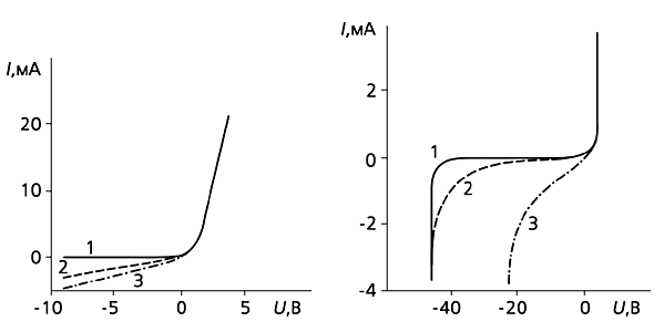Рис. 7. Вольтамперные характеристики диода КД522Д (а) и БИС типа КР1005ВИ1 (б):