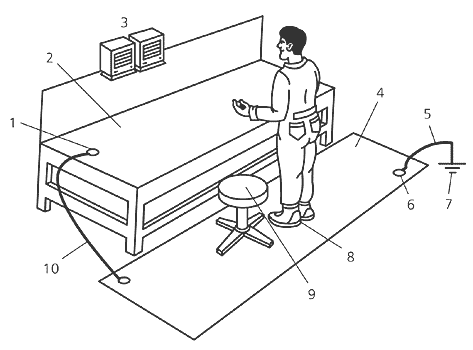 1 - клемма заземления; 2 - поверхность стола; 3 - источник ионизированного воздуха; 4 - проводящий коврик; 5 - заземляющий провод;