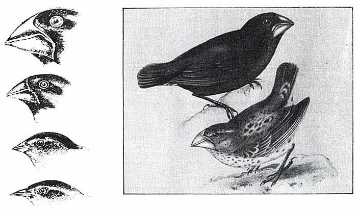 и сравнительные размеры клюва четырех видов вьюрков.В это же время на заседаниях Лондонского зоологического общества, в которых принимал участие и Дарвин, орнитолог Дж. Гулд докладывал результаты исследований орнитологических коллекций Дарвина. Гулд установил, что 25 из 26 наземных птиц Галапагосов родственны птицам Южной Америки, и высказал предположение, что три формы пересмешников, обитающие на разных островах, являются самостоятельными видами *. Но самое главное, Гулд первым использовал размер и форму клюва у вьюрков Галапагосов в качестве видового признака систематики и выделил 14 видов-эндемиков, которые составили близкородственную группу, названную им родом Geospiza **.