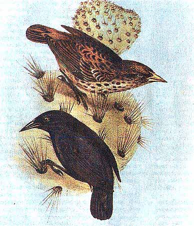 Один из видов толстоклювых вьюрков Галапагосского архипелага (справа)