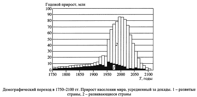 Следуя демографу Ландри, который на примере Франции открыл демографический переход, справедливо считать все время от середины XVIII в. до конца XXI в. эпохой демографической революции. Мы видим, что она представляет собой самое существенное событие в истории человечества с момента появления наших далеких предков 1-2 млн. лет назад. Тогда в процессе эволюции жизни на Земле появился человек разумный. Теперь же мы приблизились скорее к пределу способностей его разума, чем к пределу ресурсов его материального бытия.
