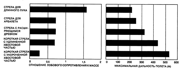 Во-вторых, сравнительный анализ отношений лобового сопротивления к массе для всех четырех типов стрел показал, что стрела для лука значительно уступала по своим летным качествам трем остальным. Массу стрелы можно рассматривать как меру ее способности сохранять кинетическую энергию. Если бы все эти стрелы были запущены с одной и той же скоростью, то масса каждой из них определяла бы запас энергии стрелы в начальный момент. Скорость расходования энергии зависит от лобового сопротивления. Малое значение отношения лобового сопротивления к массе означает вероятность того, что дальность полета стрелы будет большой.